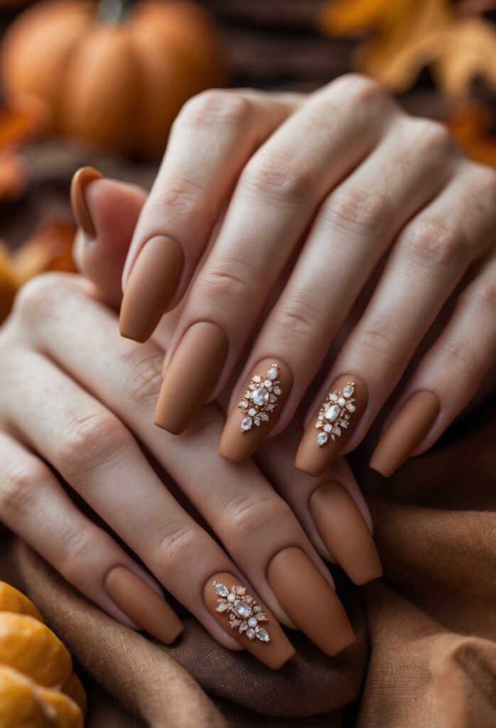 35. Matte camel nails with rhinestones mix comfort and glam.