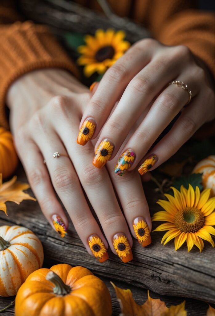 15. Pumpkin and sunflower combos bring late-fall cheer to nails.