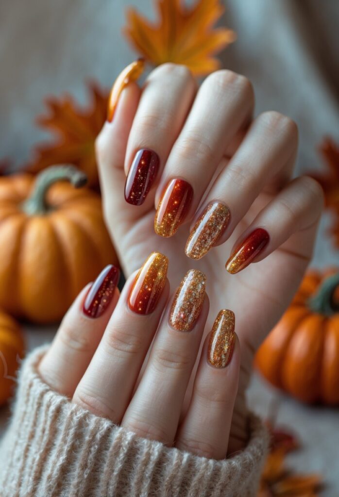 Glitter ombre blends shimmering particles gradually from the nail base to tip, adding dimension and sparkle. This effect suits colors like deep plum, burnt orange, and forest green, which resonate with fall’s richness.
