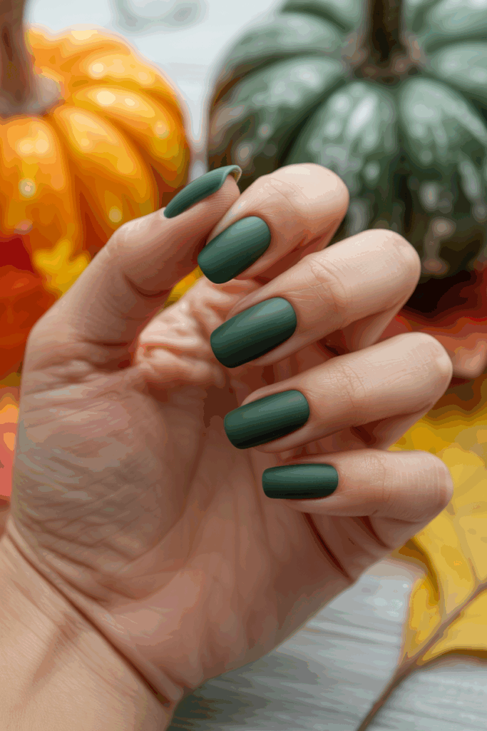 7. Matte forest green nails evoke cozy pine forests and cool weather.