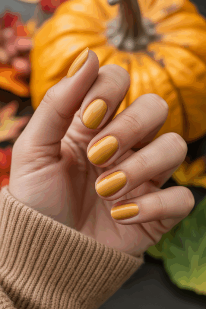 6. Mustard yellow nails pop against cozy layers and warm tones.