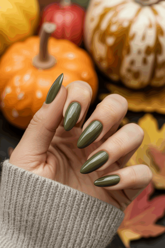 4. Olive green almond nails bring a muted, earthy elegance to your hands.