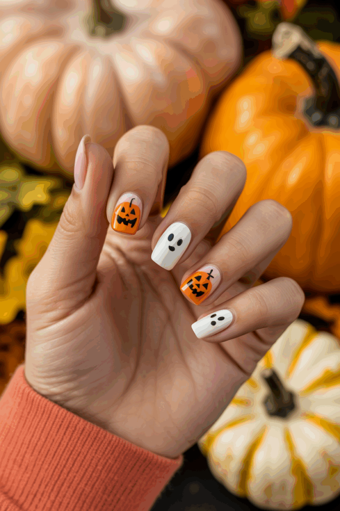 18. Pumpkin and ghost nails mix cute and spooky in one set.
