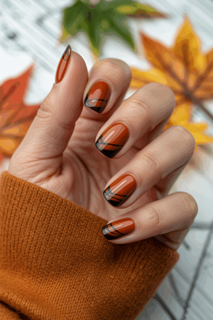 The shape of the tips often varies, from traditional rounded edges to sharper stiletto or almond tips, adding subtle personality. Some designs add a thin glitter line for understated sparkle. This style suits those who prefer elegance with a warm fall twist.