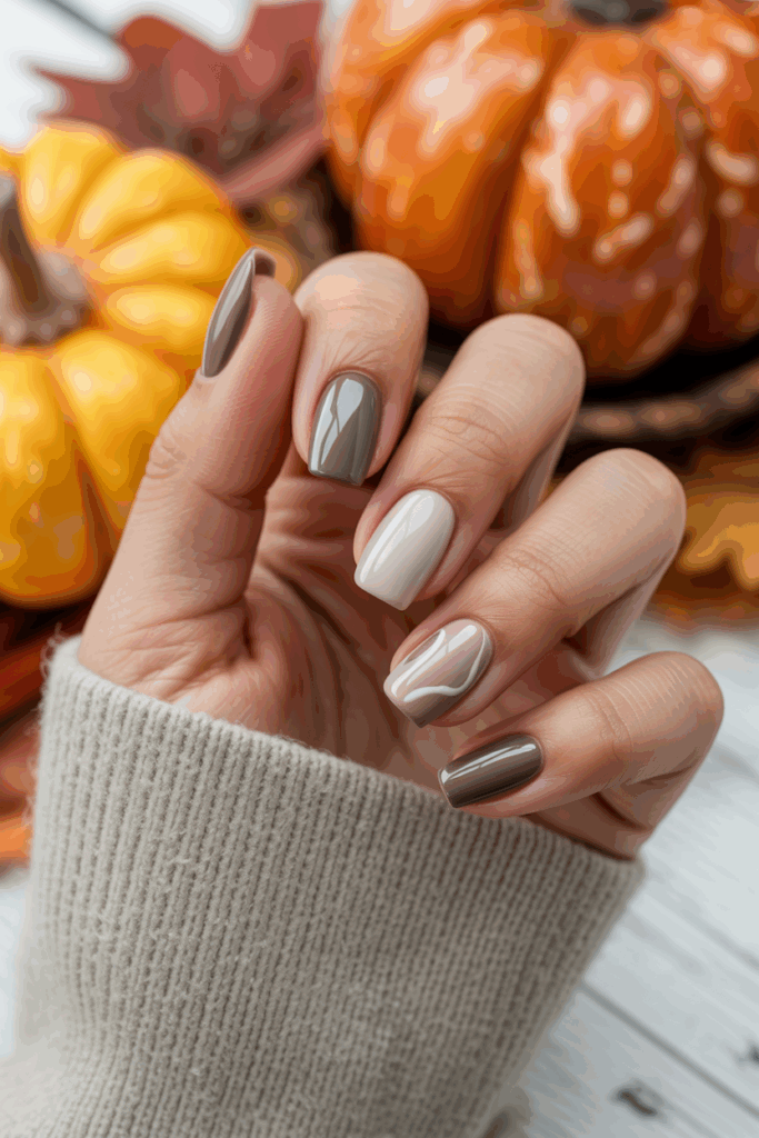 These nails provide a tactile element that enhances the autumn feel. They work well on both short and long nails. The combination of neutral base colors with textured details creates a polished but casual look.