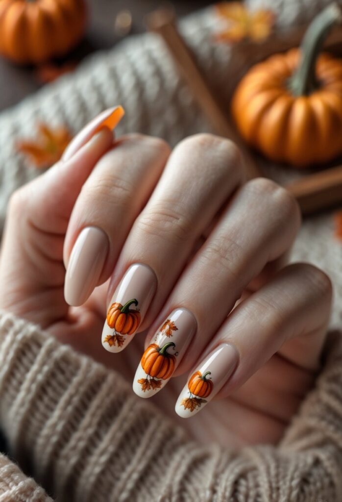 11. Pumpkin accent nails add seasonal charm to any nude or neutral base.