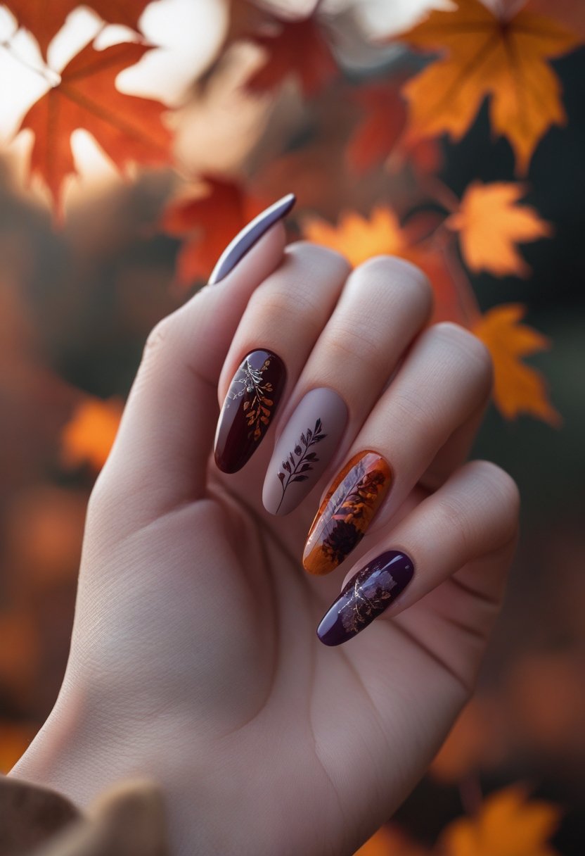 Artistic autumn nail designs showcase complex visuals using color contrast and detailed brushwork to reflect the season’s mood.