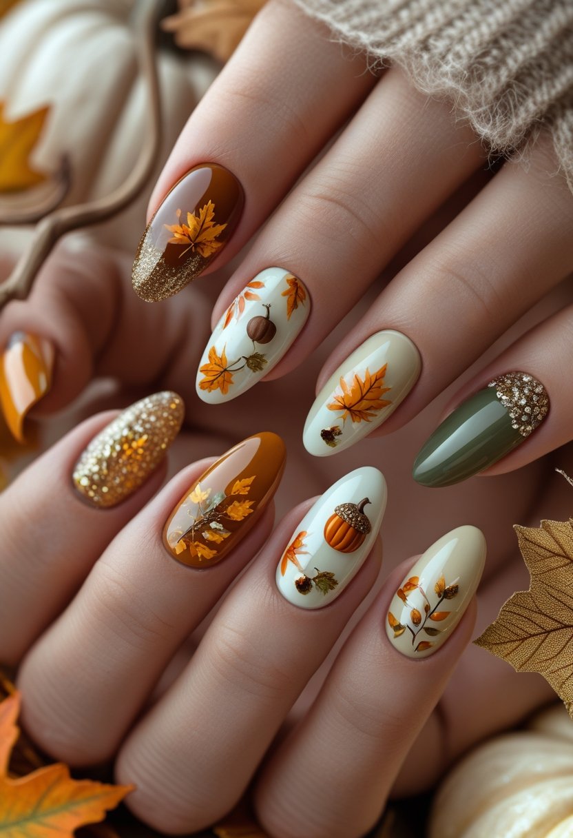 Hand-painted autumn nails feature tiny detailed illustrations reflecting nature or seasonal themes.