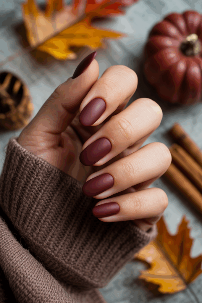 The deep burgundy matte finish is a popular choice for fall nails. It offers a rich, velvety look that feels elegant without being too flashy. This finish works well on almond shapes, balancing boldness with subtlety.