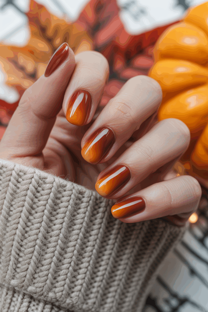 Burnt sienna ombre nails blend warm reddish-brown tones with lighter shades. This style adds depth while staying subtle and autumn-appropriate.