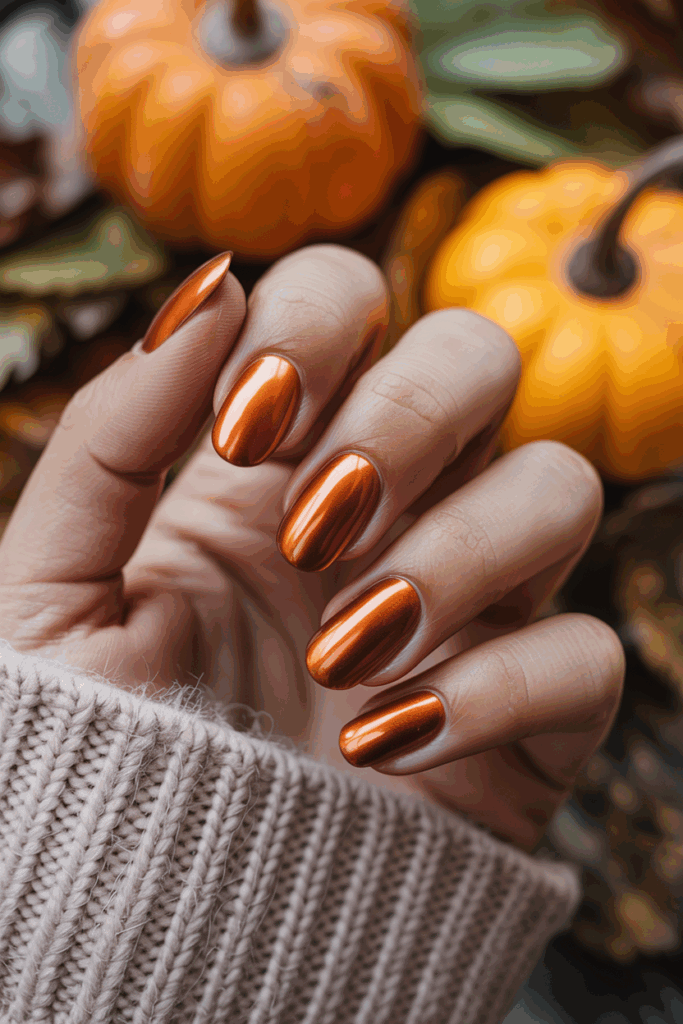 Copper metallic chrome nails bring a warm, shiny look perfect for October. The reflective finish mirrors autumn’s cozy tones.