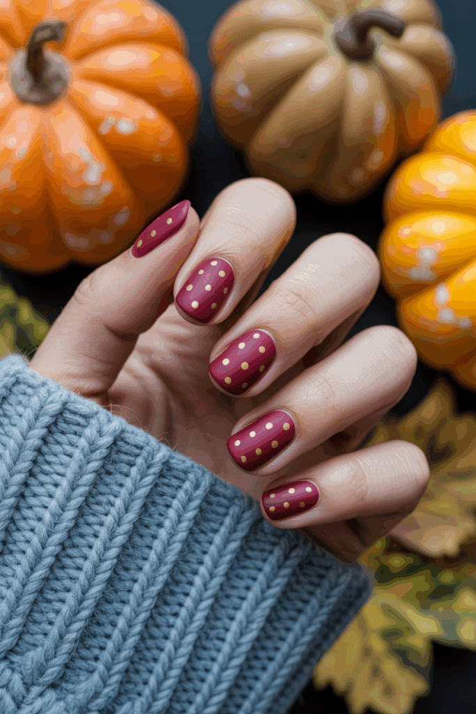 This nail design pairs deep cranberry red with small matte gold dots. The rich red base feels warm and fitting for fall.