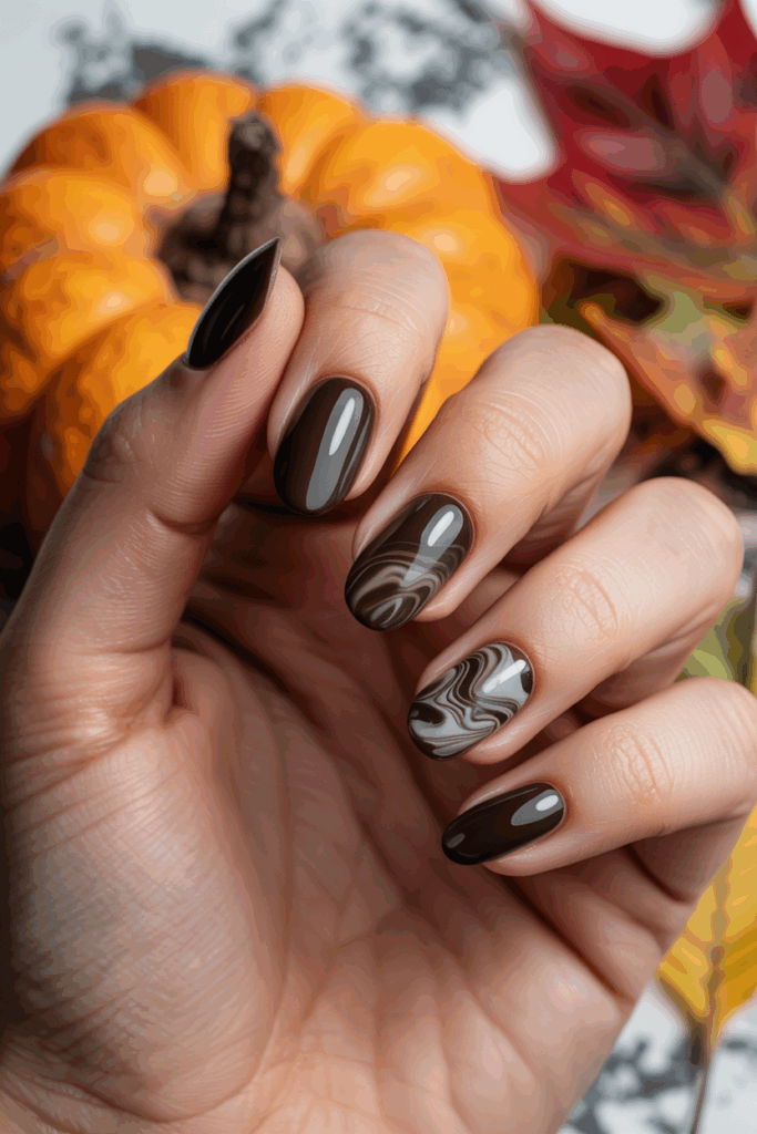 This nail look blends dark chocolate shades with a smooth marble pattern. It offers a warm, elegant feel perfect for fall.