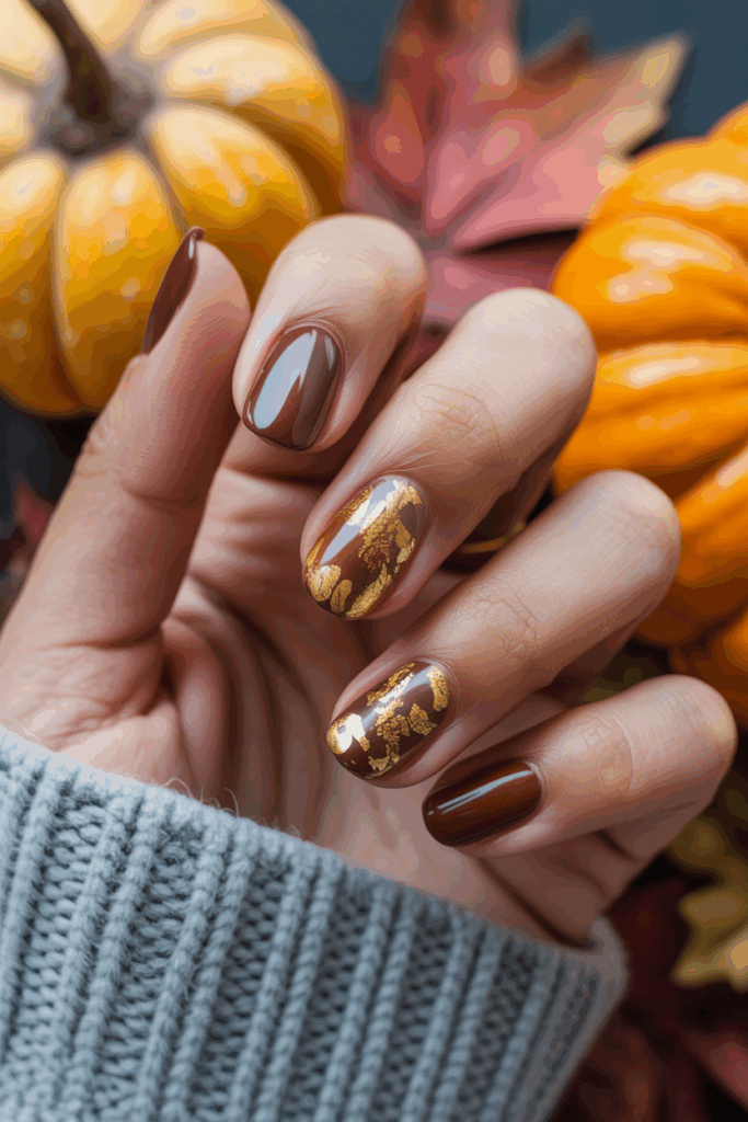 This look pairs warm brown nails with shiny gold foil details. The gold adds a luxurious touch to the cozy autumn tones. It fits well with fall’s natural colors and feels both stylish and simple.