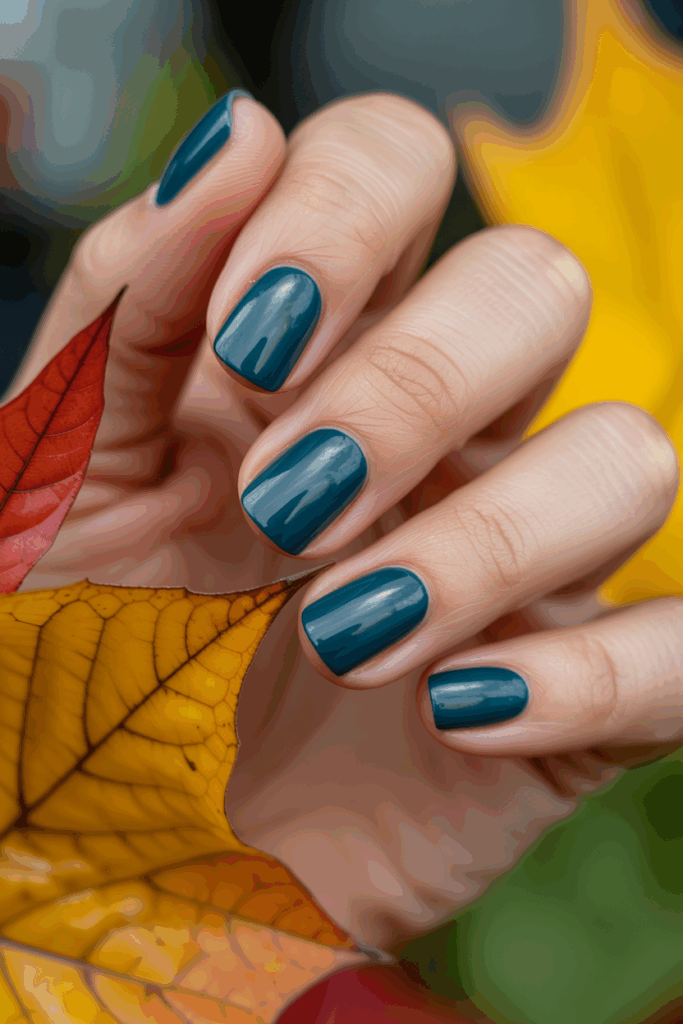 Dark teal is a rich color that fits well with fall tones. The shiny topcoat adds a polished finish, making nails look sleek and smooth.