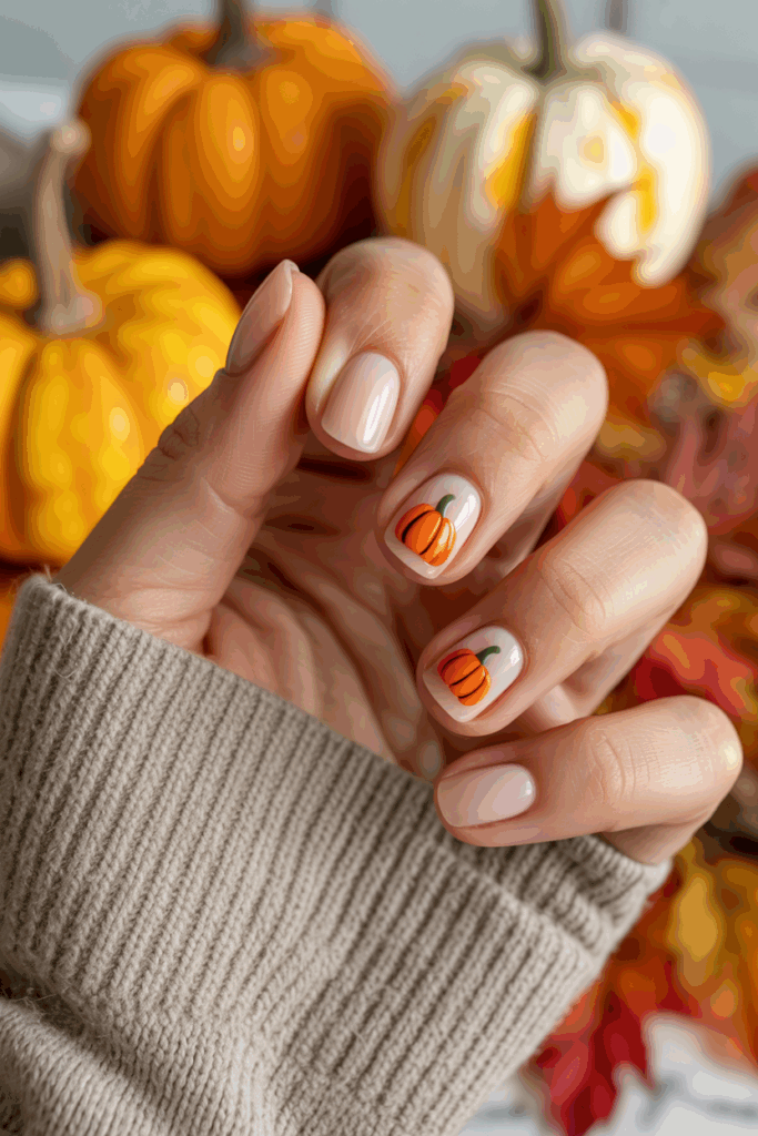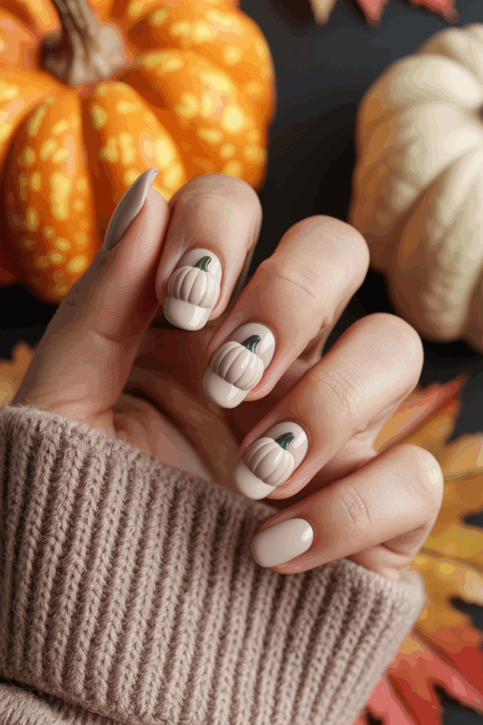 This nail design uses soft beige tones to create a calm, neutral base. Small 3D pumpkin accents add a subtle, autumn touch without overwhelming the look. It’s a simple way to bring seasonal style to everyday nails.