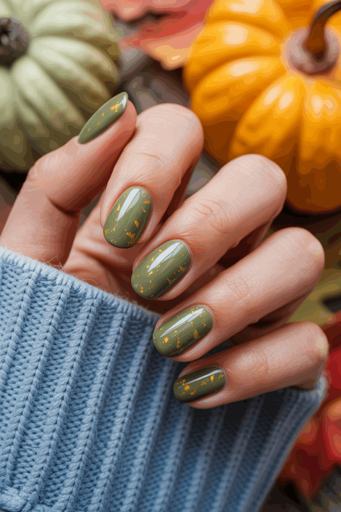 This nail design pairs deep olive green with small gold flecks. The gold adds a subtle shine without overpowering the earthy tone. It is a simple yet elegant choice for October.