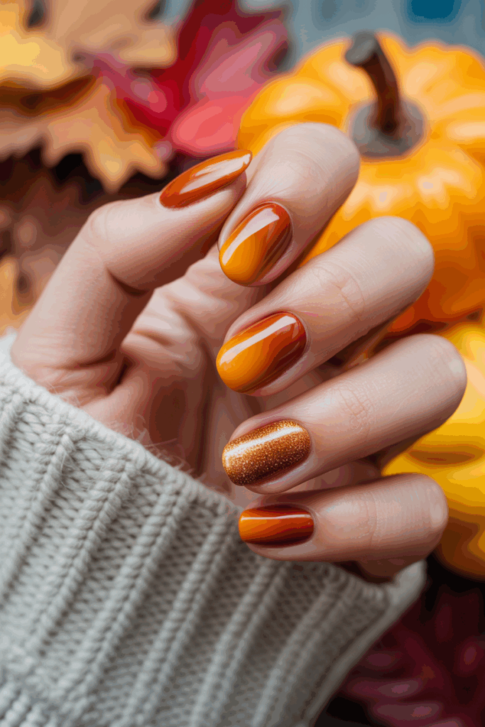 It works well on any nail length and can be paired with a nude or blush base. The gradient effect creates a smooth transition between colors, perfect for fall.