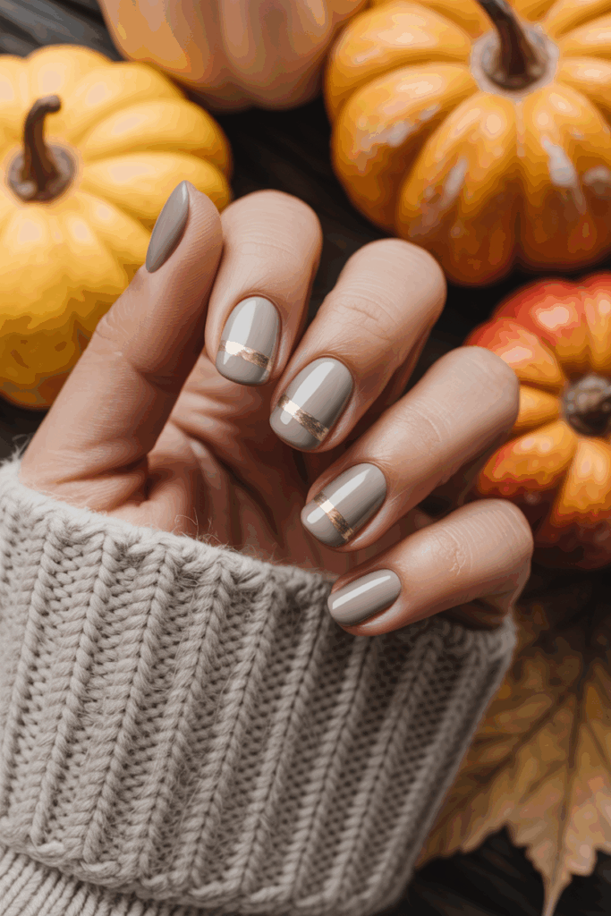 This look pairs warm taupe nails with thin metallic stripes. The neutral base keeps it simple. The metallic lines add a modern and sleek touch. It works well for fall, blending subtle color with a bit of shine.