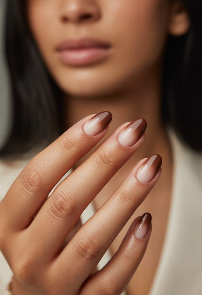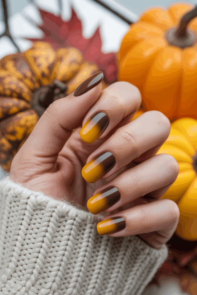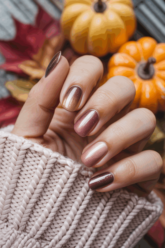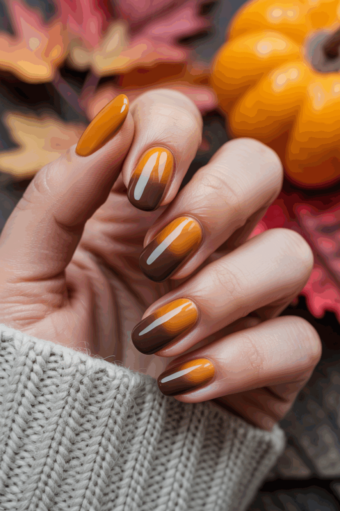 This ombre style blends rich brown tones into soft beige. It creates a natural, warm look suited for fall. The smooth gradient works well on any nail shape or length. It offers a simple yet elegant way to wear autumn colors.