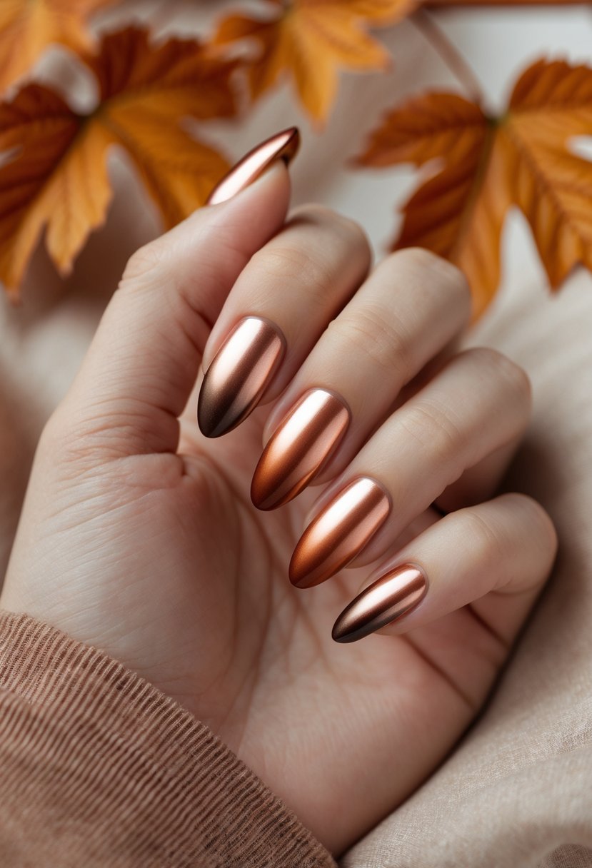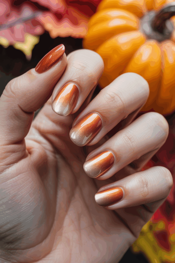 This design blends shiny metallic copper with deep burnt sienna. The gradient creates a smooth transition that looks elegant on oval nails. It offers a warm, rich tone perfect for the fall season. The metallic finish adds a modern edge to a classic autumn color.