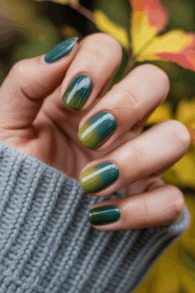 This ombre style blends deep forest green with soft olive shades. It creates a calm, natural look that fits well with fall themes.
