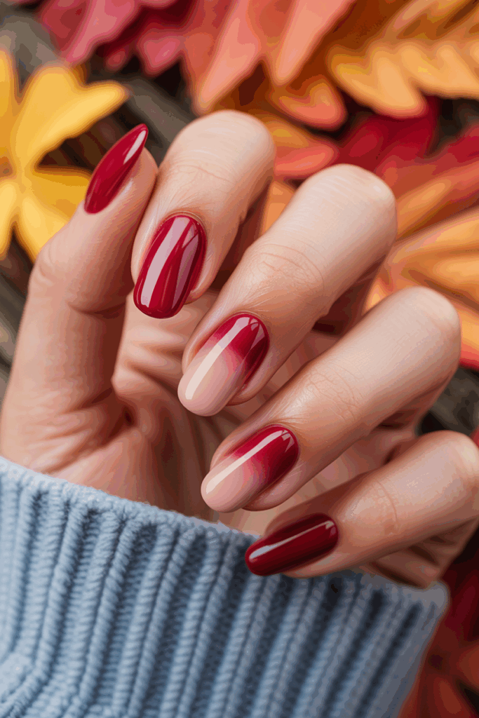 Cranberry nails are a classic autumn favorite, but blending them into nude gives a fresh, refined twist. The gradient effect elongates your nails visually, while the gloss creates a glass-like sheen that feels luxurious. It’s perfect for anyone who wants a little drama balanced by softness.