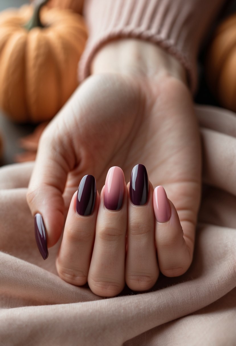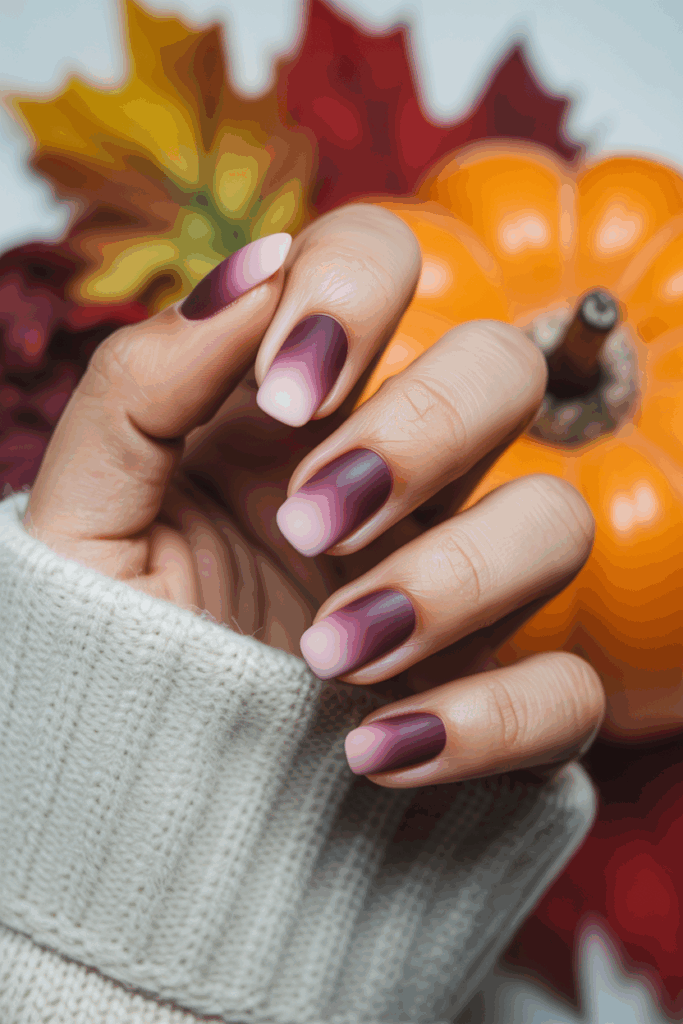This ombre style blends deep plum with gentle pink. It creates a smooth, elegant fade perfect for fall. The dark shade adds richness while the pink softens the look, making it versatile for both day and night.