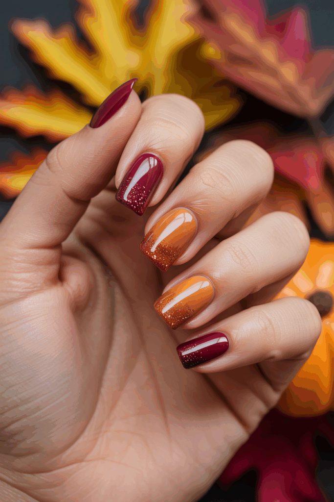 This ombré style fades from a gentle peach to a warm brick red. It offers a smooth, natural look with a touch of autumn richness. The colors work well together, creating a balanced and elegant fall manicure. It suits casual and formal occasions alike.