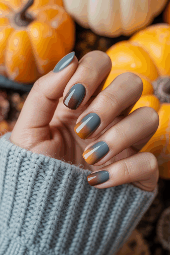 The gradual shift from cool gray to cozy brown highlights the season’s contrast. It works well for both short and long nails.