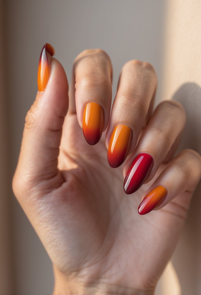 This design blends burnt orange and deep red for a smooth ombre effect.