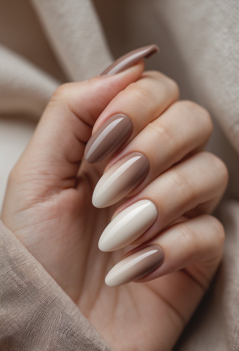 This ombre nail design blends warm taupe with soft cream tones. It creates a calm, natural look suitable for fall. The smooth gradient adds subtle elegance without being too bold. This style works well for any occasion and matches easily with autumn outfits.