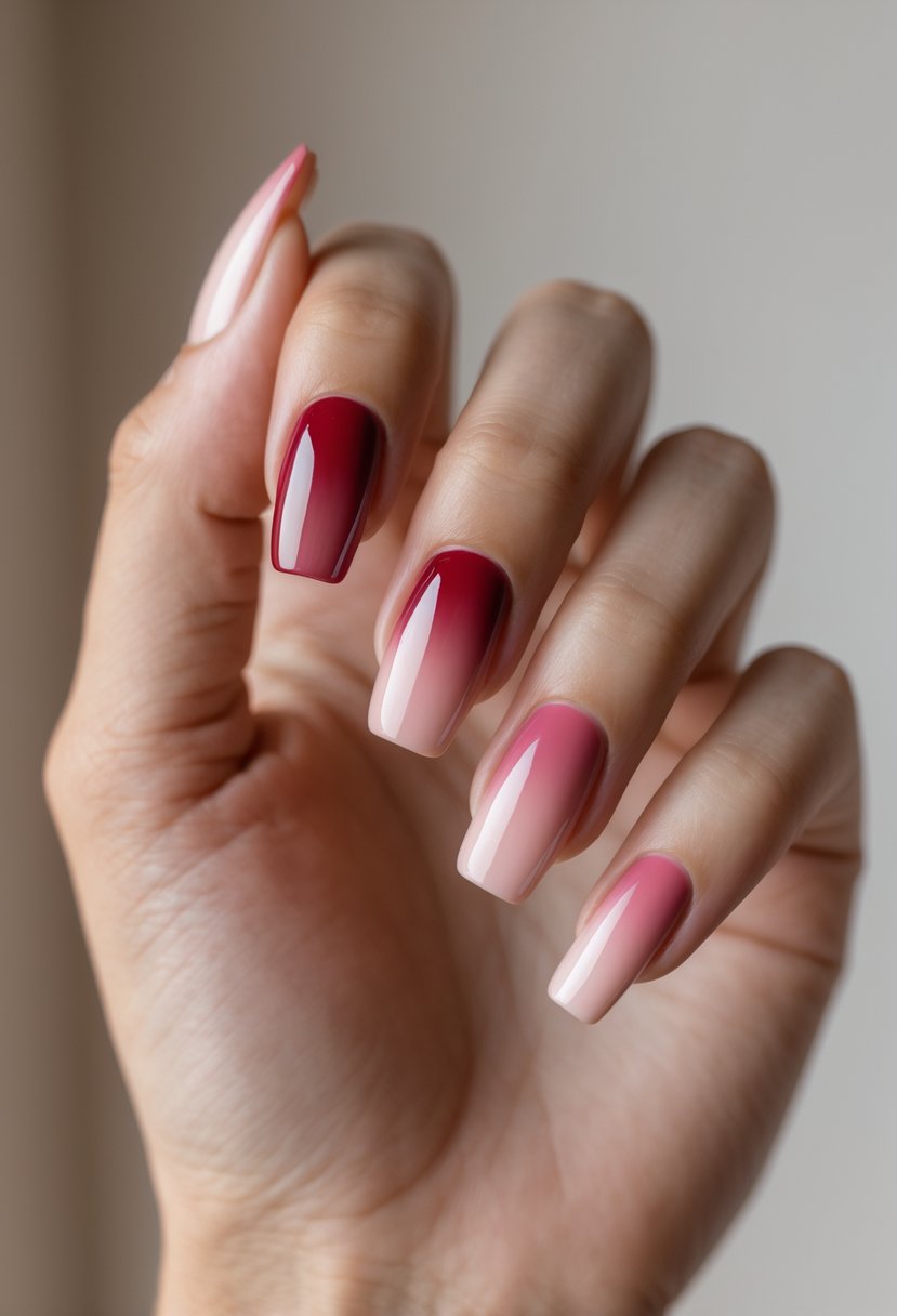 This design blends a deep cherry red into a soft blush pink. The smooth transition creates a balanced look that suits fall well. It combines boldness with subtlety, making it a versatile choice. This gradient works nicely for both casual and more dressed-up styles.