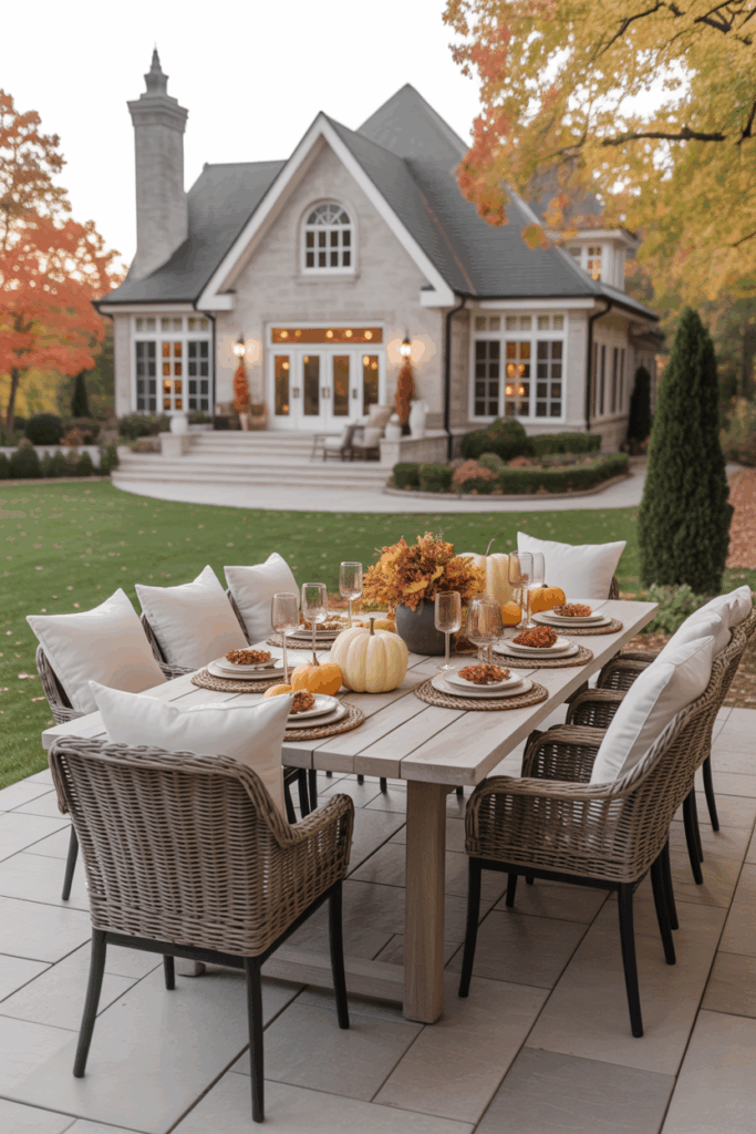 Candles, lanterns, or string lights above the table complete the ambiance. It’s perfect for Thanksgiving outdoors or casual fall dinners.