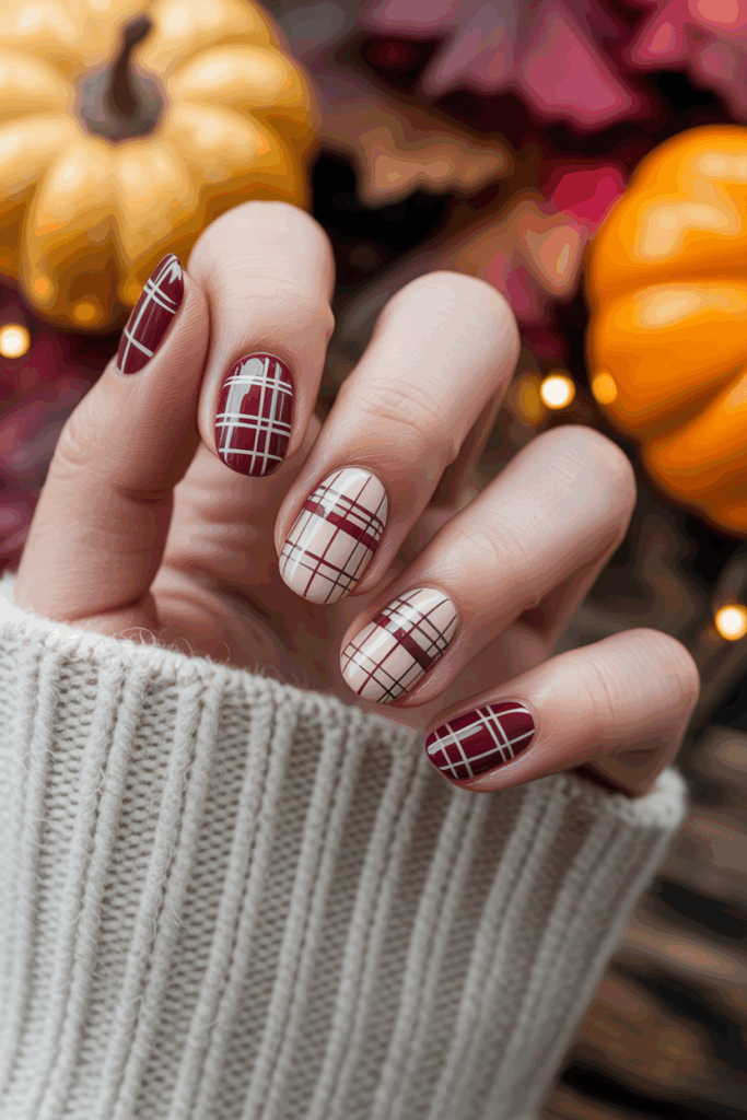 This design pairs rich burgundy with soft cream for a classic fall look. The plaid pattern is simple but eye-catching. It works well on both short and long nails, adding warmth and style to any manicure.
