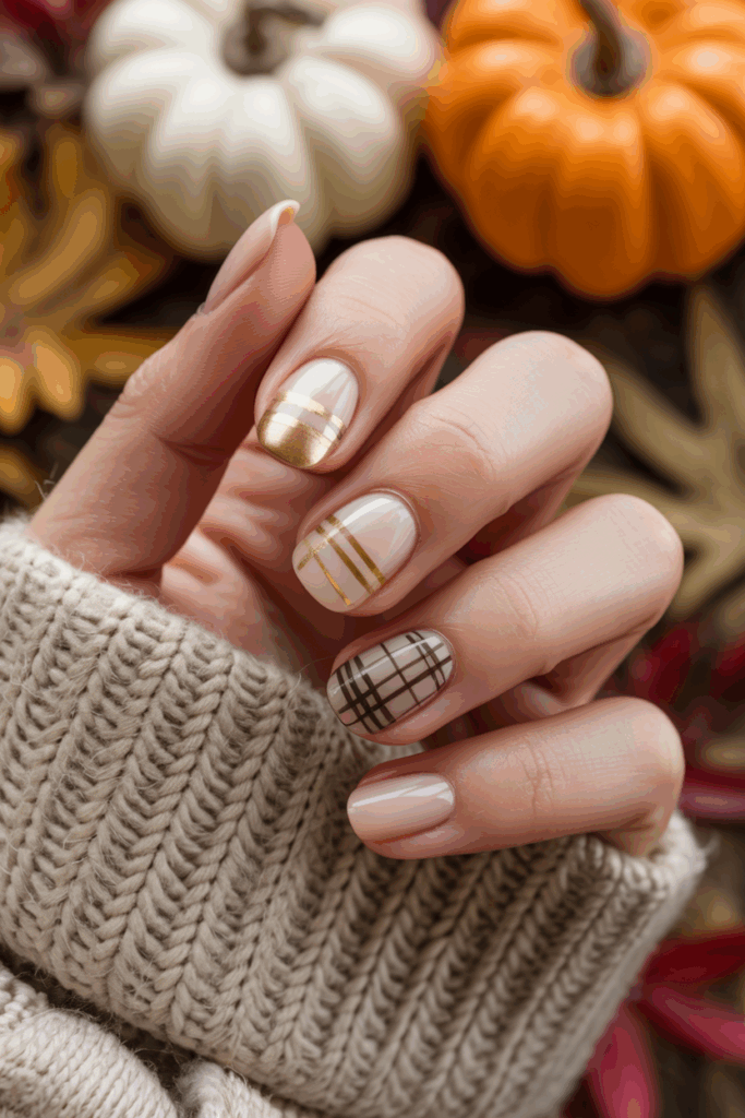 This design features a soft nude base with gold accents. The plaid pattern appears on one or two nails, adding a subtle contrast. Gold foil or small gemstones highlight the look without overpowering it, creating a stylish and elegant fall nail option.