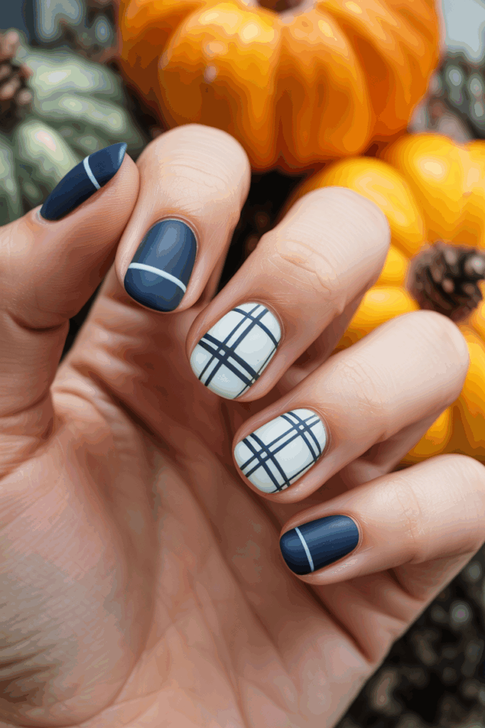 Matte navy blue nails with white plaid create a clean and modern look. This style balances bold color with a soft, non-shiny finish. It works well for fall, offering a cool yet cozy vibe.