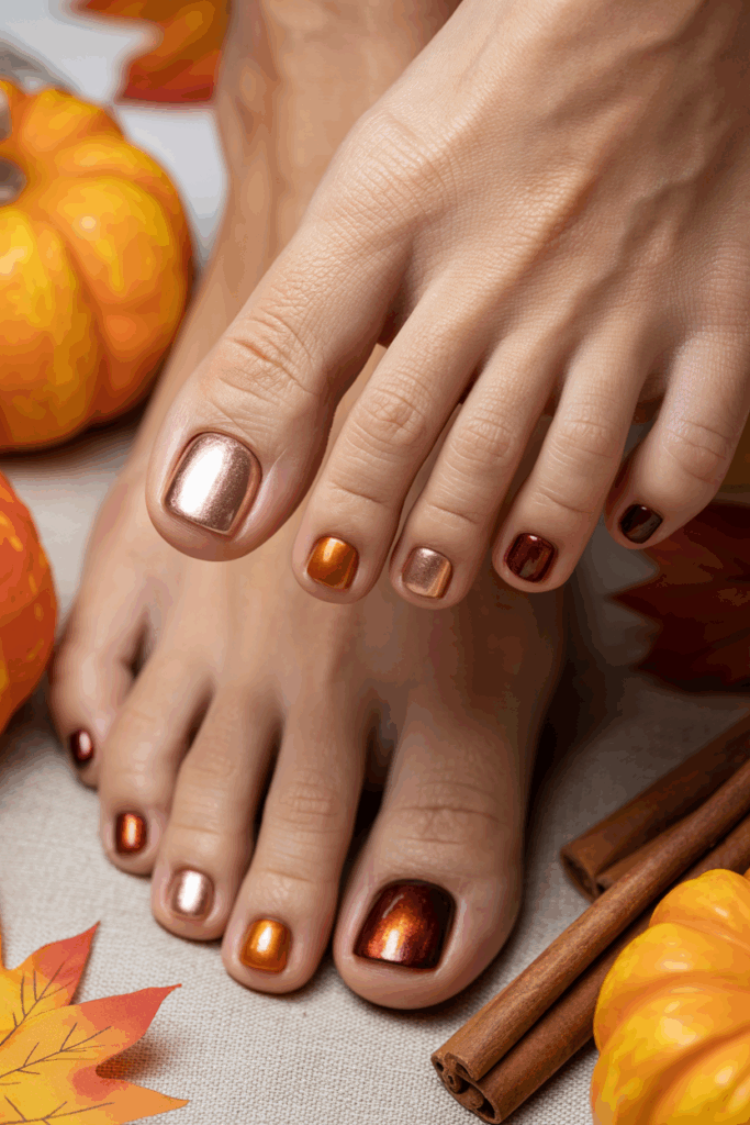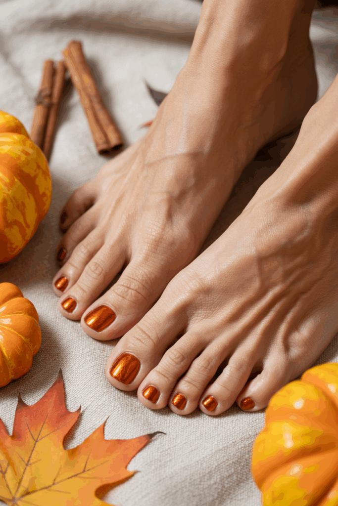Rich copper offers a warm, metallic glow perfect for fall. It complements many skin tones and adds a subtle shine to the toes. This color works well for both casual and dressy occasions during the season.