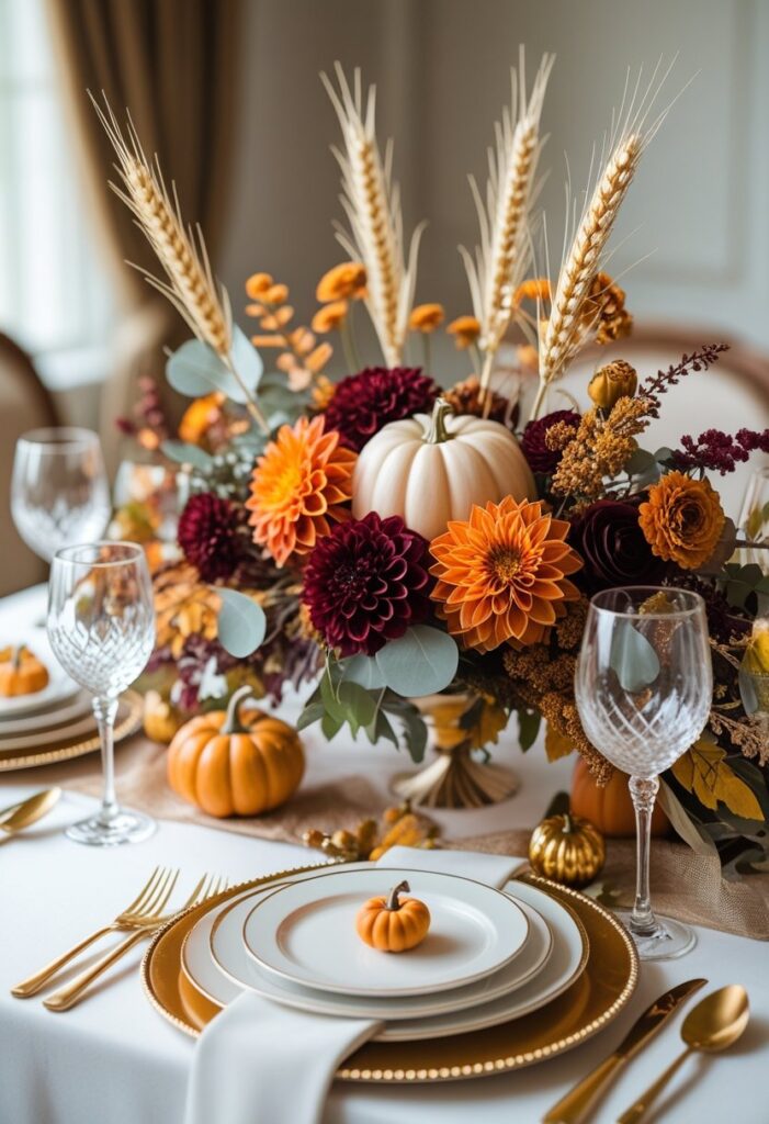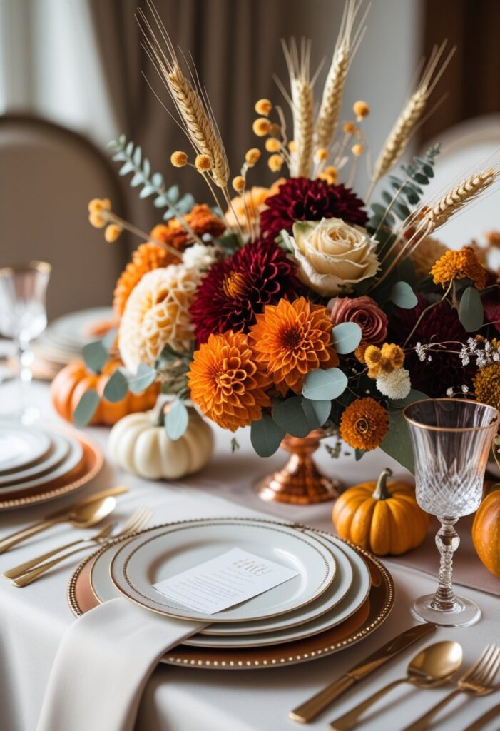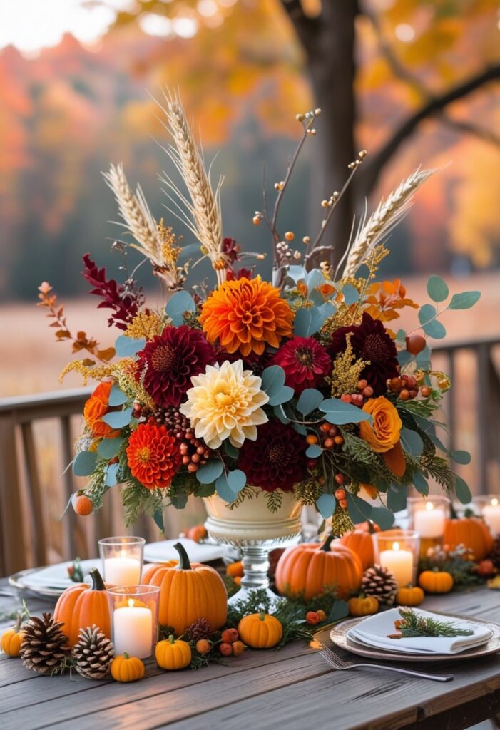 Elegant Fall Floral Centerpiece, Round Dining Table Centerpiece, Autumn Floral Arrangement, Pumpkin Decor — Style it with candles, pumpkins, and foliage for Thanksgiving, harvest parties, or autumn weddings. Works beautifully on dining tables, entry consoles, mantels, or buffet stations with cozy lighting. Pair with napkins, runners, and amber glass to build a rich palette that feels timeless and elegant.