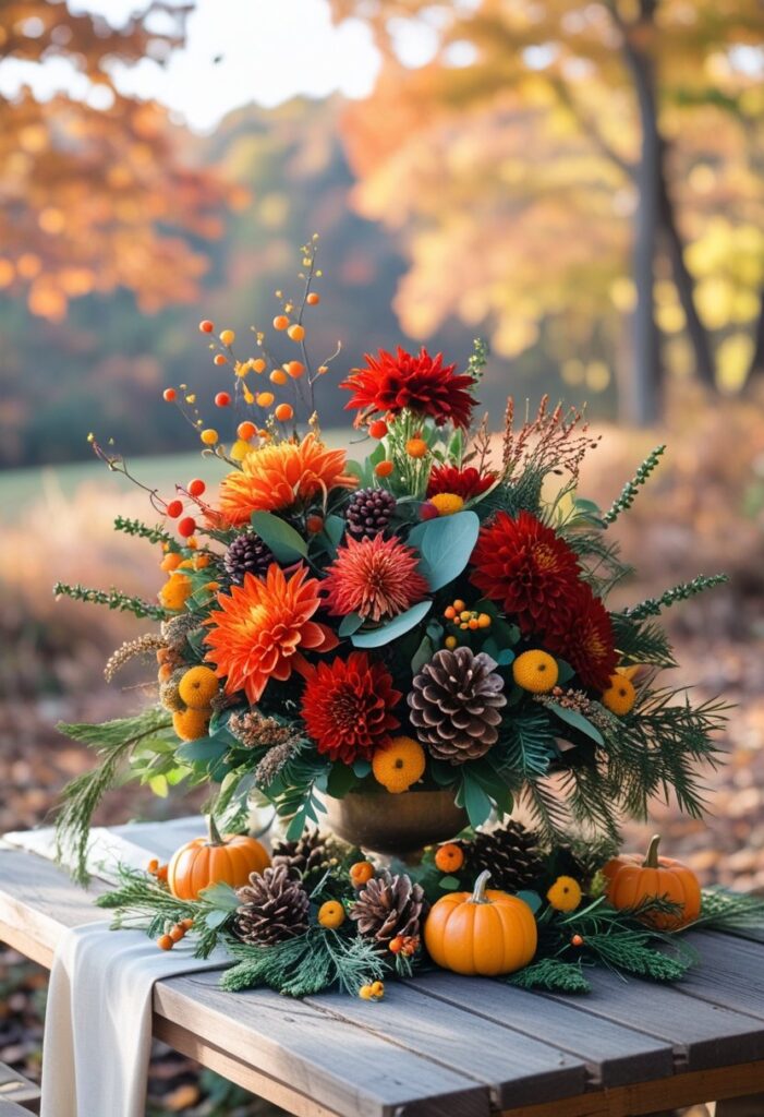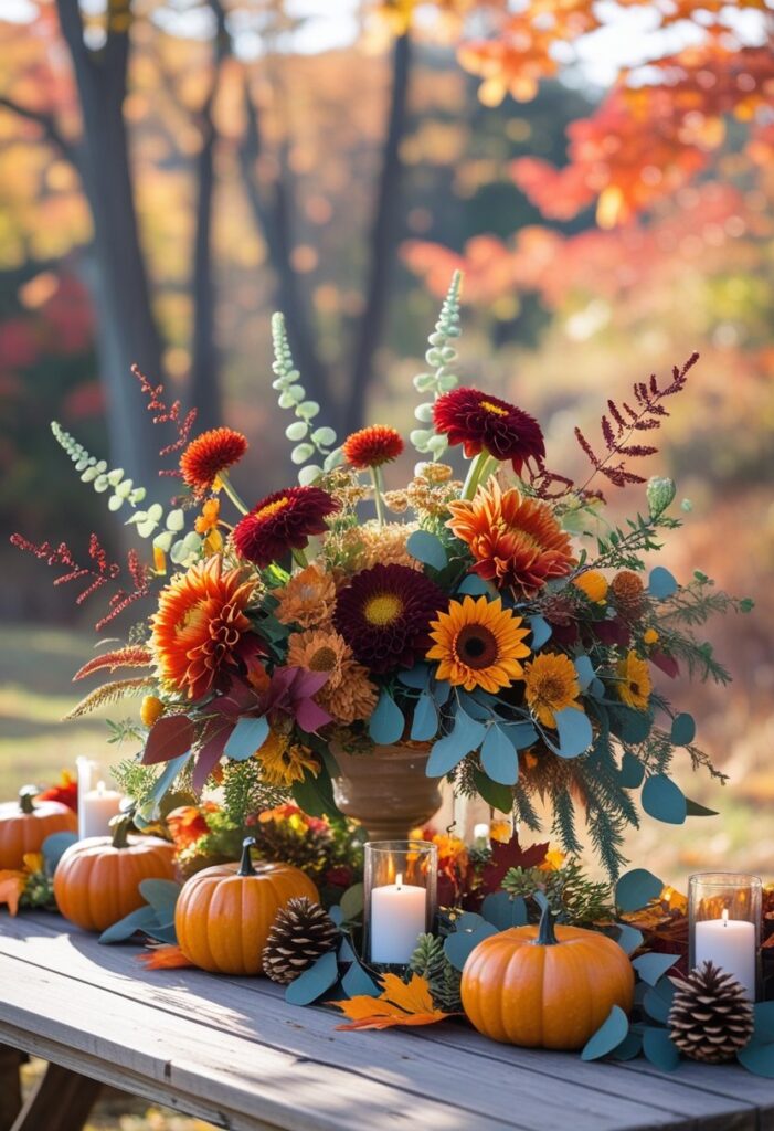 77. Rustic fall centerpiece with pumpkins and traditional fall colors – Shop this gift