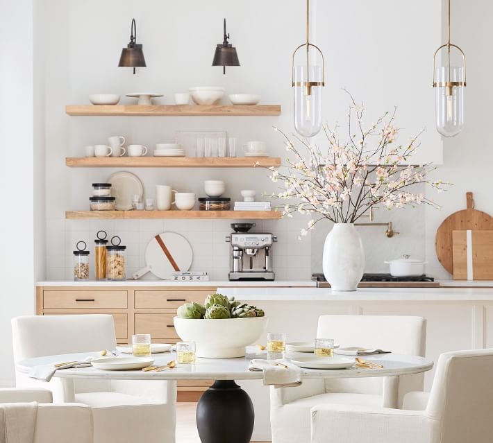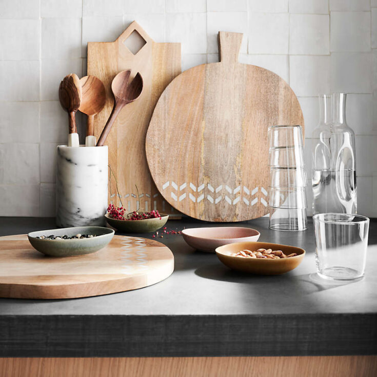 Use beautiful containers for everyday items—like wooden trays for oils, vintage crocks for utensils, or wire baskets for fruit.