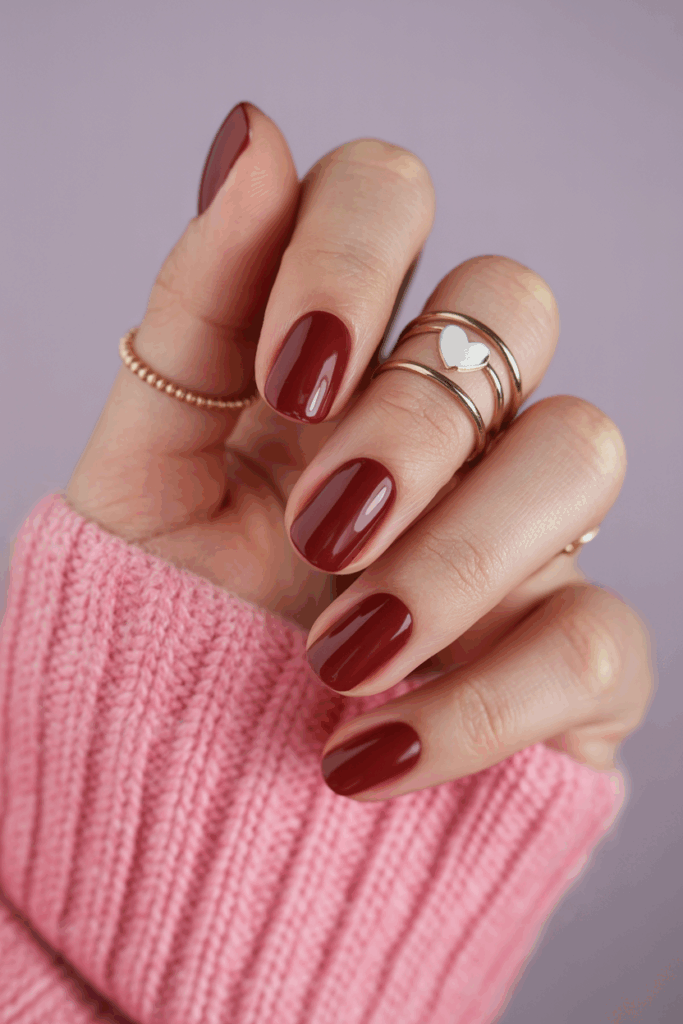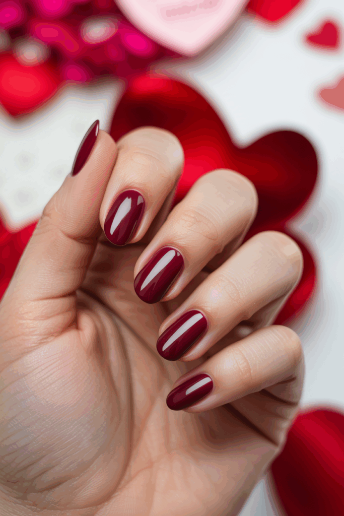 Deep burgundy is a rich, dark red that suits February well. It gives nails a classic, elegant look.