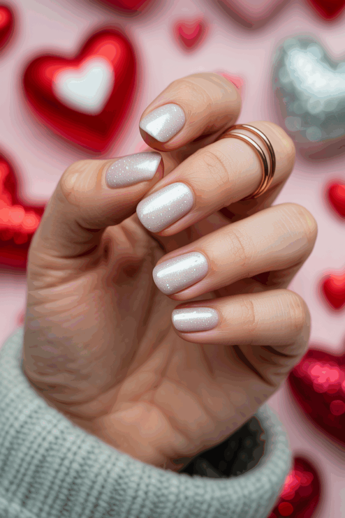 Winter white nails create a clean and fresh base perfect for February. Adding sparkle gives them a festive and elegant touch. They work well with simple glitter, snowflake designs, or silver accents to capture a subtle winter charm without being overwhelming.