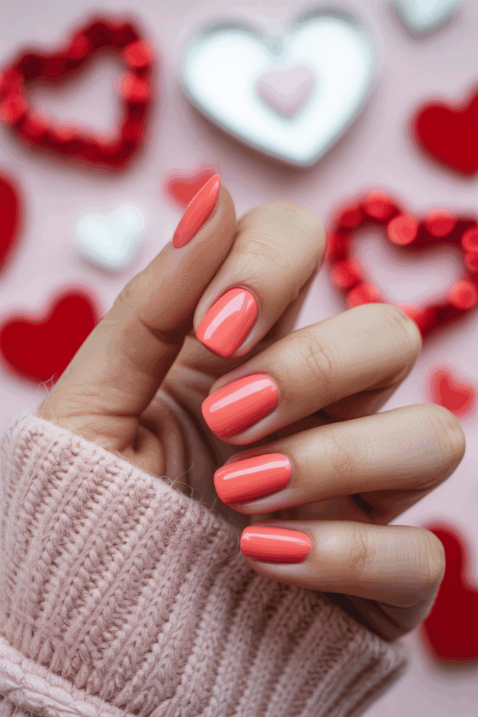 Bright coral is a lively and warm nail color. It blends red and orange tones, making it perfect for a fresh, energetic look.