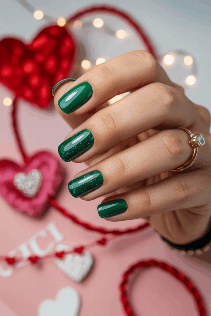 Emerald green adds a rich, jewel-toned touch to Valentine’s Day nails. It works well as an accent color alongside reds or pinks.