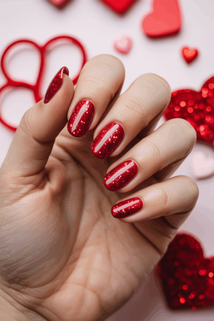 Candy apple red nails with glitter add a bright sparkle to a classic look. The glitter enhances the shine without overpowering the color. This style suits many occasions, especially festive or romantic events. It gives a polished and lively finish to any manicure.