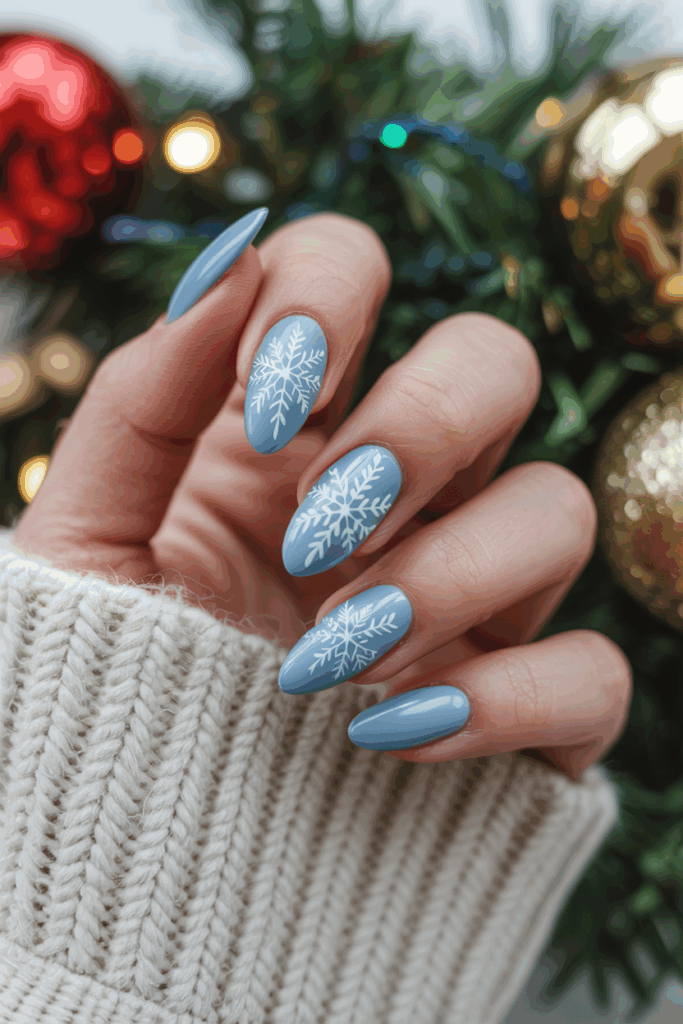 Almond-shaped snowflake nails combine timeless elegance with delicate detail. The tapered shape naturally elongates the fingers, providing the ideal canvas for intricate white or silver snowflake designs. Against soft pastel, nude, or icy blue bases, the snowflakes shimmer subtly, giving off the graceful look of freshly fallen snow. It’s a manicure that feels sophisticated yet whimsical, perfect for both everyday winter wear and festive celebrations.