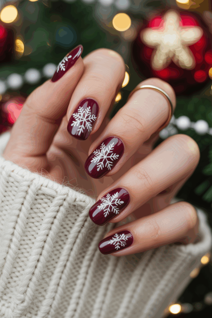 Deep burgundy nails paired with white snowflake decals strike a balance between sophistication and seasonal charm. The dark wine tone brings warmth and richness to your look, while the snowflakes add a crisp, wintry touch. A glossy topcoat enhances the overall shine, giving this manicure a polished and professional finish. It’s an elegant choice that feels cozy yet refined.