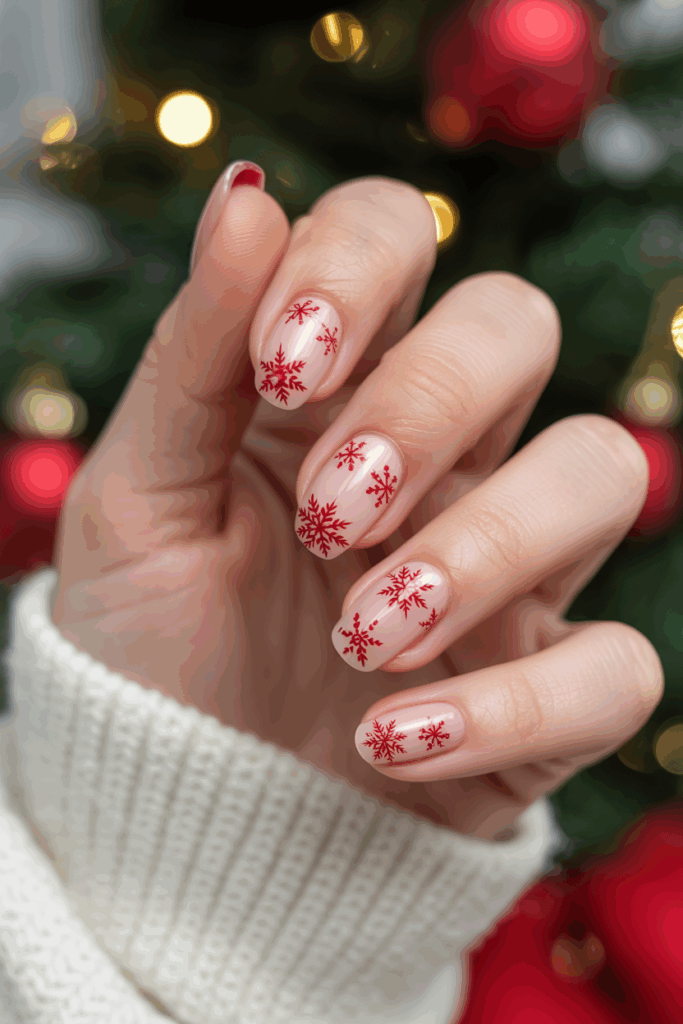 This design features delicate cherry red snowflakes on a clean nude base.