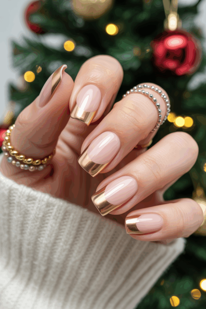 This design features a clean white base with shiny gold foil tips. The gold adds a festive, metallic look without being too bold. It works well for a simple but elegant Christmas manicure.